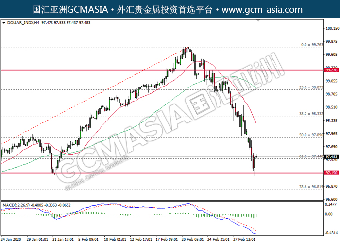 20200303 DOLLAR_INDX by willy | Mar 2, 2020 | 美元指数 | 0 comments GCMAsia - DOLLAR_INDX DOLLAR_INDX 2020-03-03 DOLLAR_INDX,H4:美指低位反弹。MACD空头动能有所略减,短期关注多头回调。上方关注97.90压力和98.30压力,下方关注97.45支撑和97.15支撑。