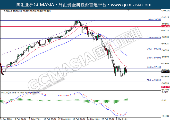 DOLLAR_INDX,H4:美指高位承压后回落。然而,MACD多头动能有所略增,短期关注多头技术性反弹。上方关注97.45压力和97.90压力,下方关注96.80支撑和96.55支撑。