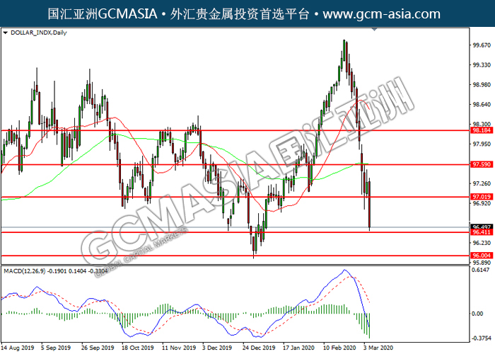 DOLLAR_INDX, Daily: 美指空头排列,目前测试前期支撑。MACD空头动能略增,若下破可关注空头为主。上方关注97.00压力和97.60压力,下方关注96.40支撑和96.00支撑。