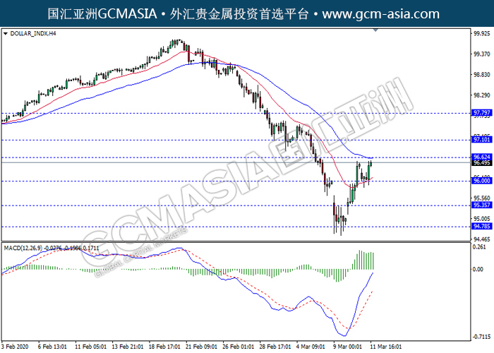 DOLLAR_INDX, H4: 美指多头排列,目前测试靠近前期压力。然而,MACD多头动能略减,短期关注空头回调为主。上方关注96.60压力和97.10压力,下方关注96.00支撑和95.35支撑。