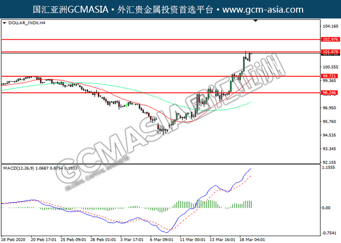 DOLLAR_INDX,H4:美指震荡上行,目前测试前期压力。然而,MACD多头动能略减,短期可关注技术性回调。上方关注101.85压力和102.95压力,下方关注99.70支撑和98.75支撑。