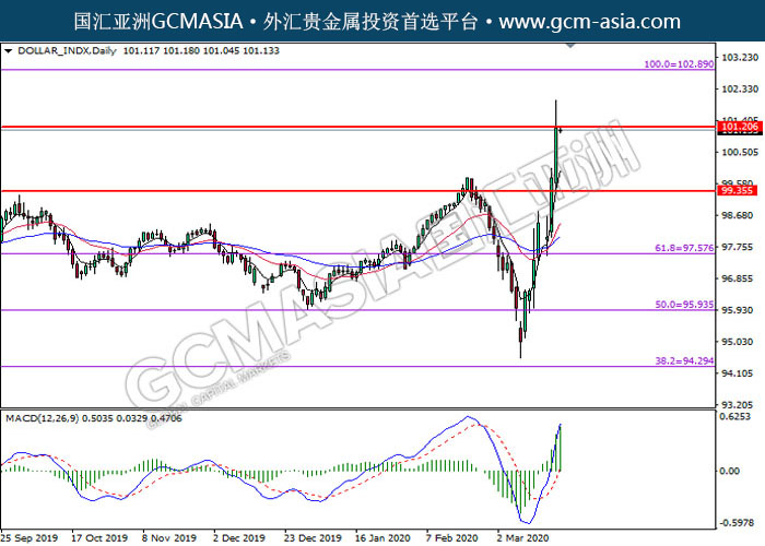 DOLLAR_INDX,Daily:美指多头排列,目前测试压力位。MACD动能持续略增,若突破可继续看多为主。上方关101.20压力和102.90压力,下方关注99.35支撑和97.60支撑。