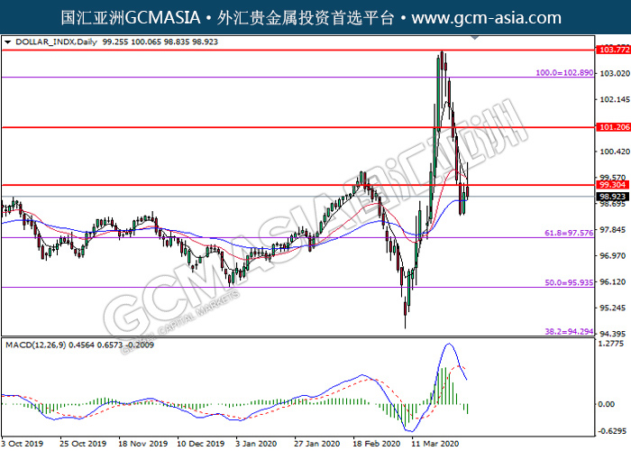 DOLLAR_INDX,Daily:美指高位承压后回落。MACD转向空头,动能略减,短期可持续关注空头走势为主。上方关99.30压力和101.20压力,下方关注97.60支撑和95.95支撑。