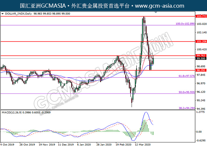 DOLLAR_INDX,Daily:美指低位反弹,目前测试着压力位。MACD转向多头,空头动能略减,若突破可关注多头走势为主。上方关99.75压力和101.20压力,下方关注98.30支撑和97.60支撑。