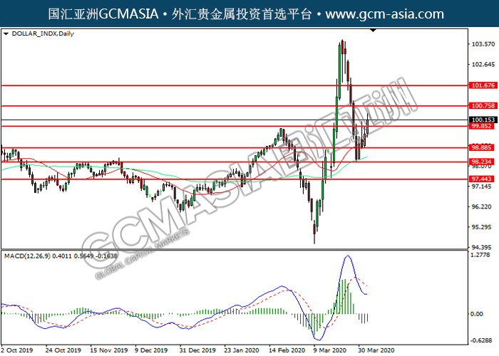 DOLLAR_INDX,Daily:美指突破前期压力,持续上行。MACD空头动能略减,短期可持续关注多头为主。上方关100.75压力和101.65压力,下方关注99.85支撑和98.90支撑。