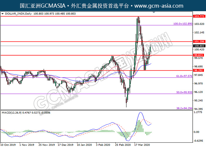 DOLLAR_INDX,Daily:美指突破后持续上行。MACD转向多头,空头动能略减,中期可关注多头走势为主。上方关101.20压力和102.90压力,下方关注99.80支撑和98.30支撑。