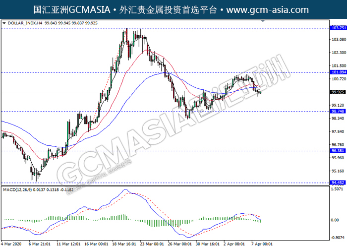 DOLLAR_INDX,H4:美指高位承压回落。MACD形成死叉,动能略减,短期继续关注空头回调趋势为主。上方关101.10压力和103.75压力,下方关注98.75支撑和96.40支撑。