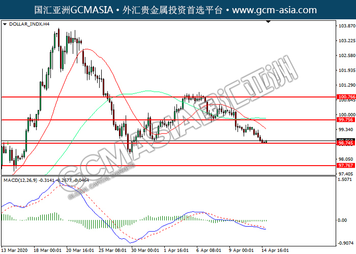 DOLLAR_INDX,H4:美指震荡下行,目前测试前期支撑。然而,MACD空头动能略减,短期可关注技术性回调。上方关99.75压力和100.75压力,下方关注98.75支撑和97.75支撑。