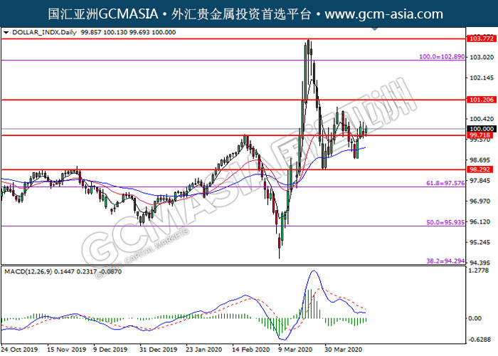 DOLLAR_INDX,Daily:美指突破后持续上行。MACD转向多头,动能略增,中期可关注多头走势为主。上方关101.20压力和102.90压力,下方关注99.70支撑和98.30支撑。