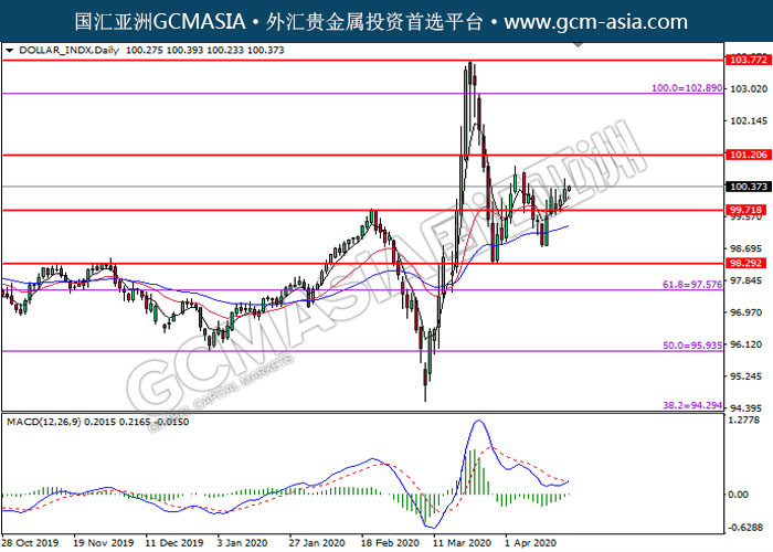DOLLAR_INDX,Daily:美指突破后持续上行。MACD转向多头,动能略增,中期可关注多头走势为主。上方关101.20压力和102.90压力,下方关注99.70支撑和98.30支撑。