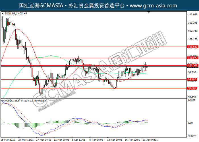 DOLLAR_INDX,H4:美指震荡上行,目前测试前期压力。然而,MACD多头动能略减,短期可关注技术性回调。上方关注100.35压力和100.85压力,下方关注99.40支撑和98.80支撑。