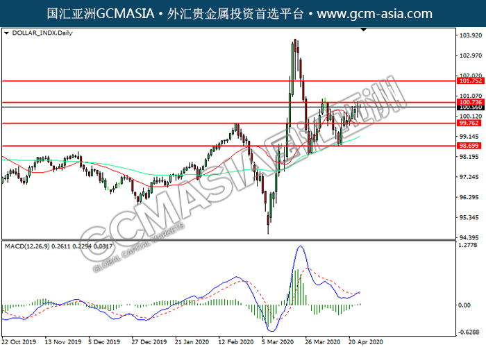 DOLLAR_INDX,Daily:美指震荡上行,目前测试前期压力。MACD已形成金叉,动能转强,若突破可关注多头为主。上方关100.75压力和101.75压力,下方关注99.75支撑和98.70支撑。