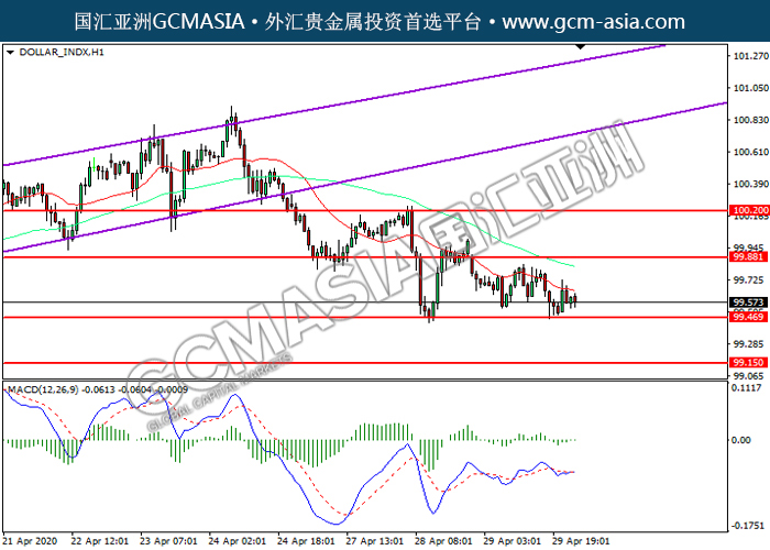DOLLAR_INDX,H1:美指震荡下行,目前靠近前期支撑。然而,MACD空头动能有所略减,短期继续关注多头反弹趋势为主。上方关99.90压力和100.20压力,下方关注99.45支撑和99.15支撑。