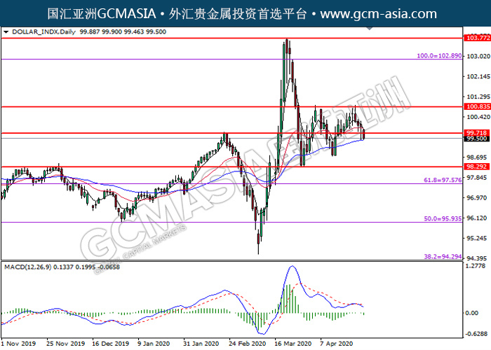 DOLLAR_INDX,Daily:美指突破后持续下行,目前测试着50均线(蓝色)。MACD仍显示空头信号,动能偏弱,若突破可关注空头走势为主。上方关99.70压力和100.85压力,下方关注98.30支撑和97.60支撑。