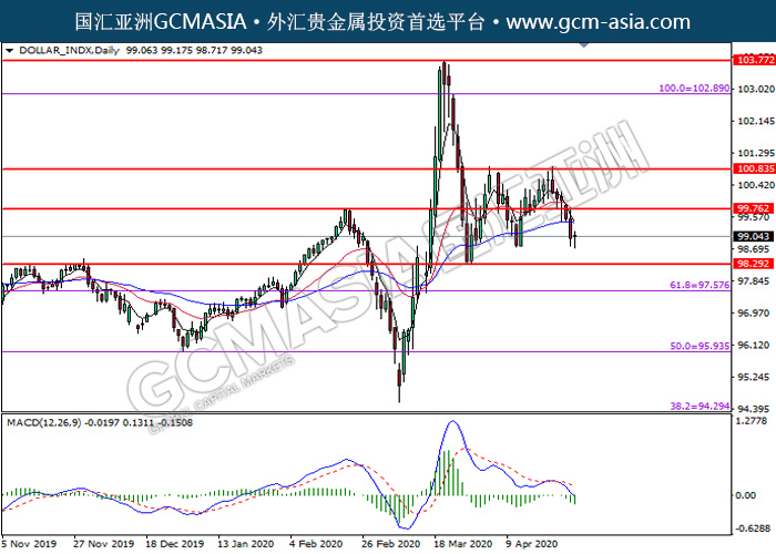 DOLLAR_INDX,Daily:美指突破后持续下行。MACD仍显示空头信号,动能偏弱,中期可关注空头走势为主。上方关99.75压力和100.85压力,下方关注98.30支撑和97.60支撑。