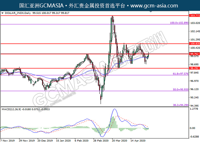 DOLLAR_INDX,Daily:美指地位反弹,目前测试着压力位。MACD仍显示多头信号,动能转强,若突破可关注多头走势为主。上方关99.75压力和100.85压力,下方关注98.30支撑和97.60支撑。