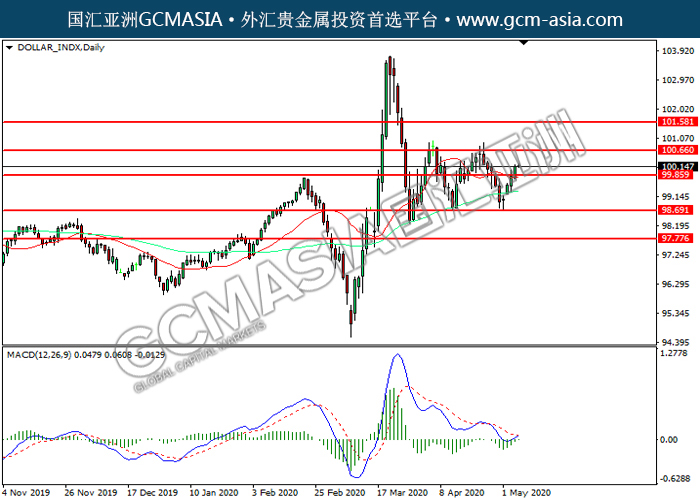 DOLLAR_INDX,Daily:美指突破前期压力,震荡上行。MACD空头动能有所略减,短期可持续关注多头为主。上方关100.65压力和101.55压力,下方关注99.85支撑和98.70支撑。