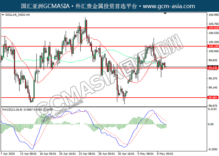 DOLLAR_INDX,H4:美指震荡下行,目前测试前期支撑。然而,MACD空头动能有所略减,短期可关注技术性回调。上方关100.20压力和100.65压力,下方关注99.65支撑和98.90支撑。
