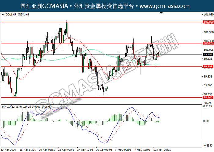 DOLLAR_INDX,H4:美指低位反弹。然而,MACD空头动能有所略增,短期可关注技术性回调。上方关100.25压力和100.85压力,下方关注99.60支撑和98.75支撑。