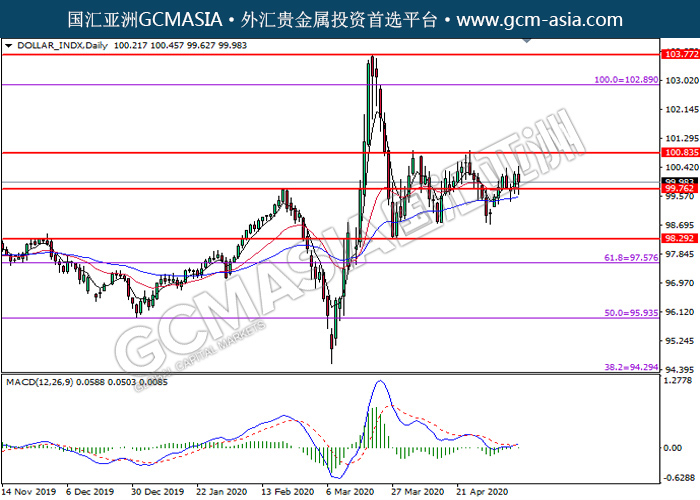 DOLLAR_INDX,Daily:美指高位承压后回落。然而,MACD显示空头动能转弱,短期可关注技术性回调为主。上方关100.85压力和102.90压力,下方关注99.75支撑和98.30支撑。