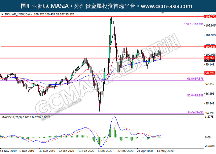 DOLLAR_INDX,Daily:美指突破后持续下行。MACD显示空头信号,中期可关注空头为主。上方关99.75压力和100.85压力,下方关注98.30支撑和97.60支撑。
