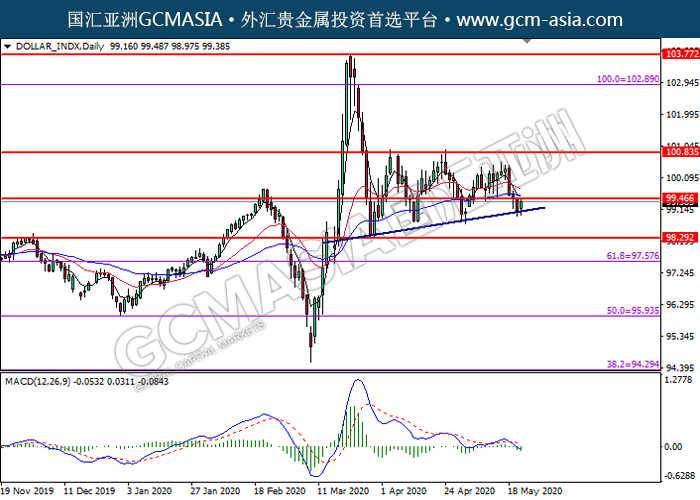 DOLLAR_INDX,Daily:美指触及上升趋势线后反弹。然而,MACD显示空头信号,中期可关注技术性回调为主。上方关99.45压力和100.85压力,下方关注98.30支撑和97.60支撑。