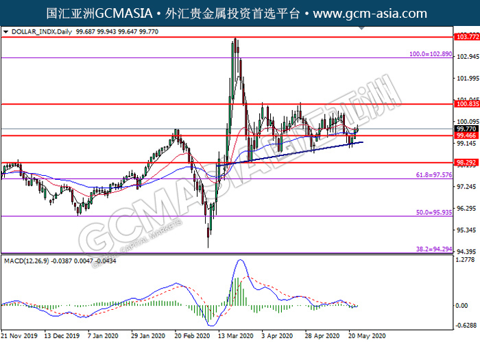DOLLAR_INDX,Daily:美指突破后持续上行。MACD显示多头信号,中期可关注多头走势为主。上方关100.85压力和102.90压力,下方关注99.45支撑和98.30支撑。