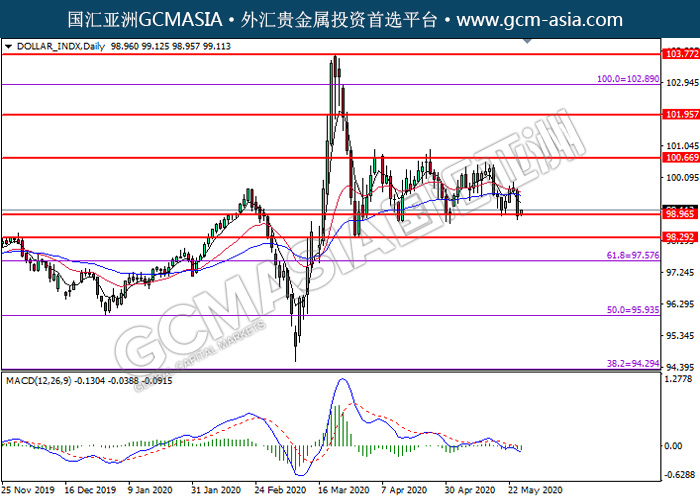 DOLLAR_INDX,Daily:美指高位承压后回落,目前测试着支撑位。MACD显示空头信号,若突破可关注空头走势为主。上方关100.65压力和101.95压力,下方关注98.95支撑和98.30支撑。