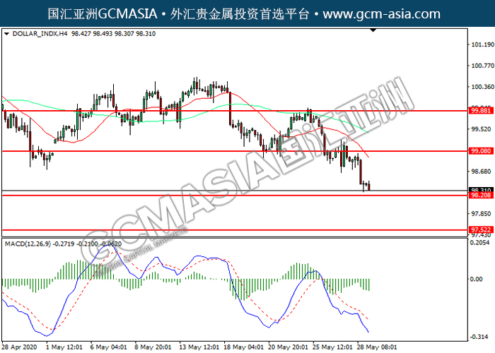 DOLLAR_INDX,H4:美指空头排列,目前测试前期支撑。MACD空头动能略增,若下破可关注空头为主。上方关99.10压力和99.90压力,下方关注98.20支撑和97.50支撑。