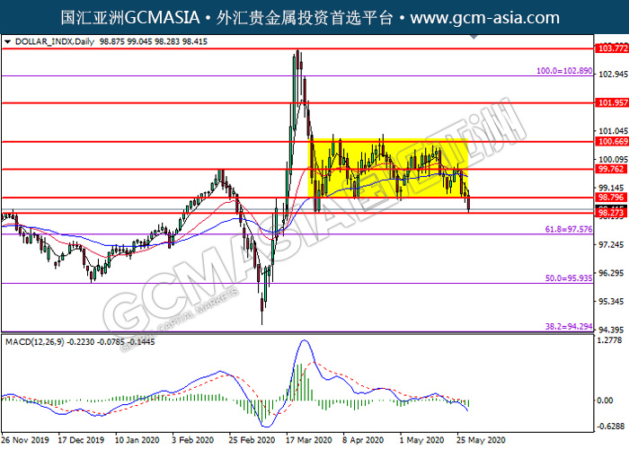 DOLLAR_INDX,Daily:美指突破后持续下行,目前测试着支撑位。MACD显示空头信号,若突破可关注空头走势为主。上方关98.80压力和99.75压力,下方关注98.25支撑和97.60支撑。
