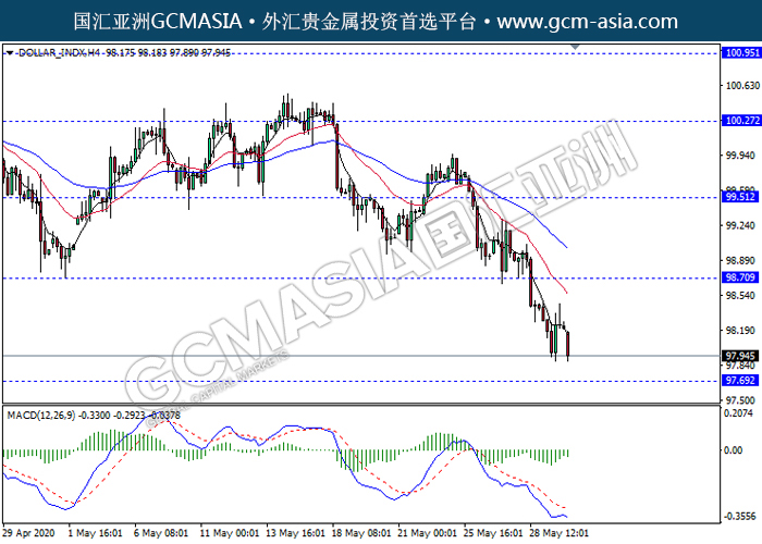 DOLLAR_INDX,H4:美指空头排列,目前测试靠近前期支撑。MACD动能持续略减,若突破继续看空为主。上方关98.70压力和99.50压力,下方关注97.70支撑和96.50支撑。