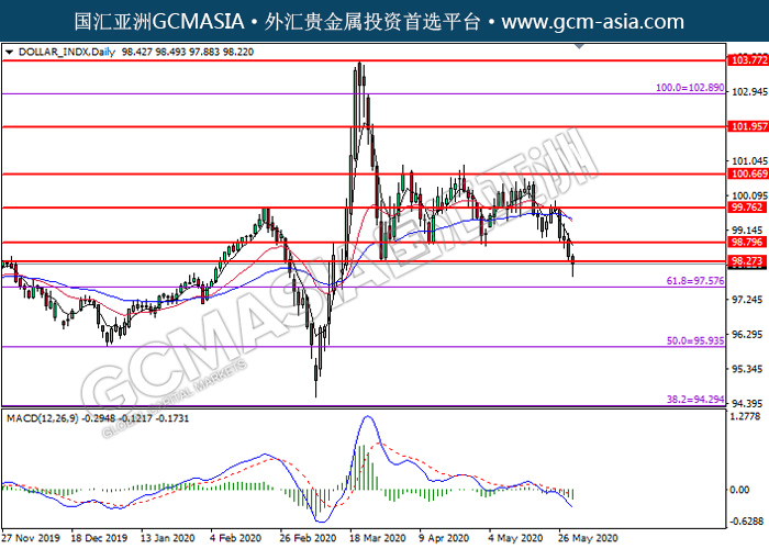 DOLLAR_INDX,Daily:美指突破后持续下行,目前测试着支撑位。MACD显示空头信号,若突破可关注空头走势为主。上方关98.80压力和99.75压力,下方关注98.25支撑和97.60支撑。