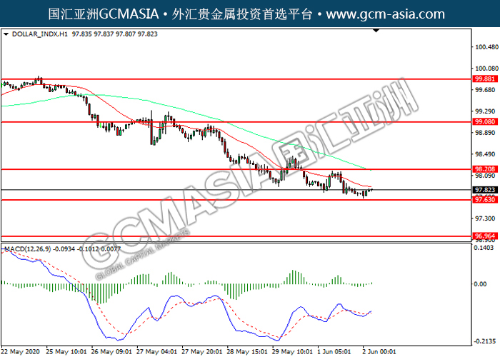 DOLLAR_INDX,H1:美指震荡下行,目前测试前期支撑。MACD已形成金叉,动能转强,短期可关注多头为主。上方关98.20压力和99.10压力,下方关注97.65支撑和96.95支撑。