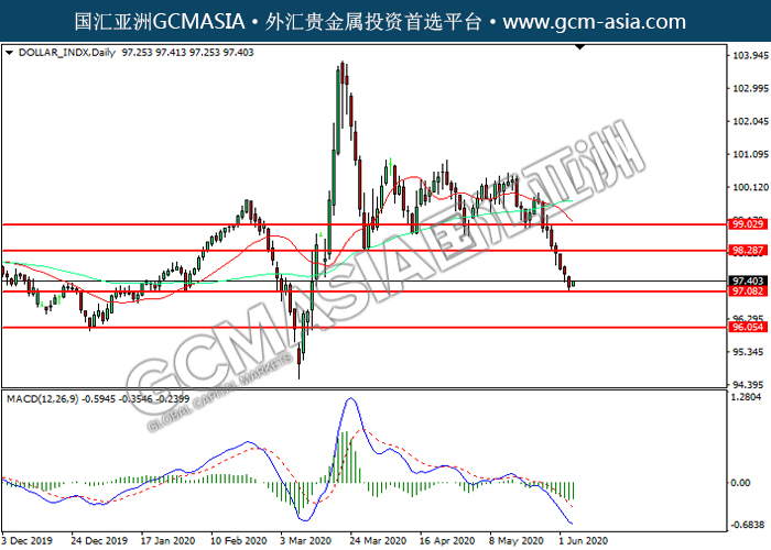 DOLLAR_INDX,Daily:美指震荡下行,目前测试前期支撑。然而,MACD空头动能略减,短期可关注多头为主。上方关98.30压力和99.05压力,下方关注97.10支撑和96.05支撑。