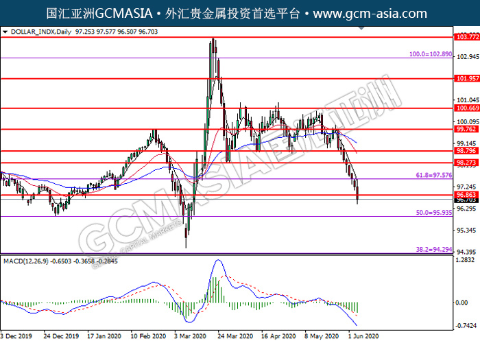 DOLLAR_INDX,Daily:美指突破后持续下行,目前测试着支撑位。MACD显示空头信号,若突破可关注空头走势为主。上方关97.60压力和98.25压力,下方关注96.85支撑和95.95支撑。