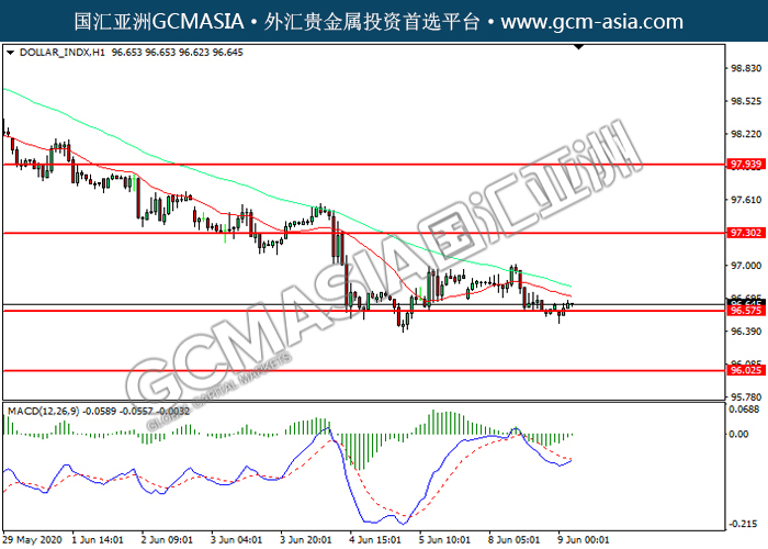 DOLLAR_INDX,H1:美指震荡下行,目前测试前期支撑。然而,MACD空头动能略减,短期可关注技术性回调为主。上方关97.30压力和97.95压力,下方关注96.55支撑和96.05支撑。