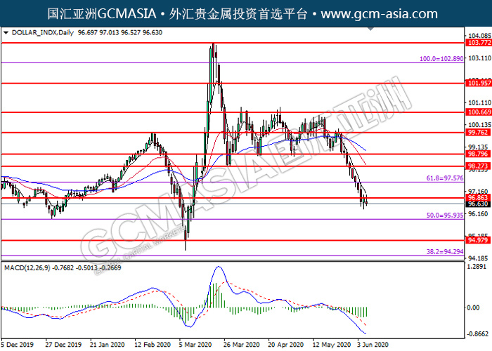 DOLLAR_INDX,Daily:美指突破后持续下行。MACD显示空头信号,短期可关注空头走势为主。上方关96.85压力和97.60压力,下方关注95.95支撑和95.00支撑。