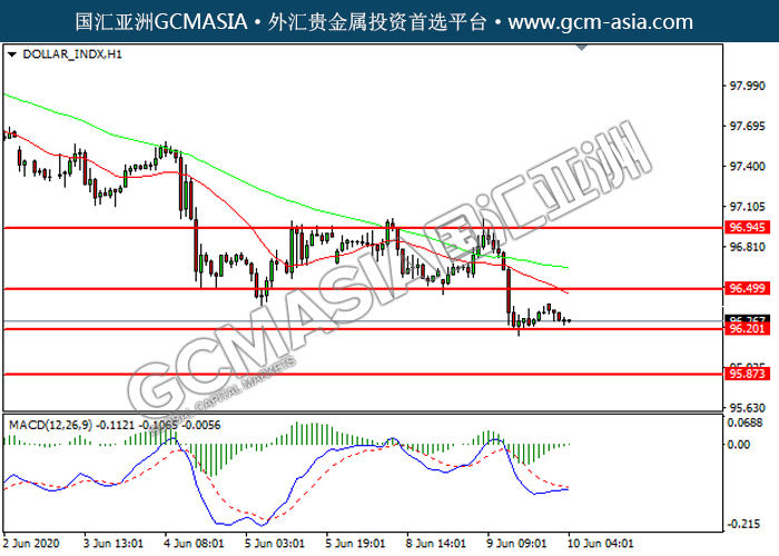 DOLLAR_INDX,H1:美指震荡下行,目前测试前期支撑。然而,MACD空头动能略减,短期可关注技术性回调为主。上方关注96.50压力和96.95压力,下方关注96.20支撑和95.85支撑。