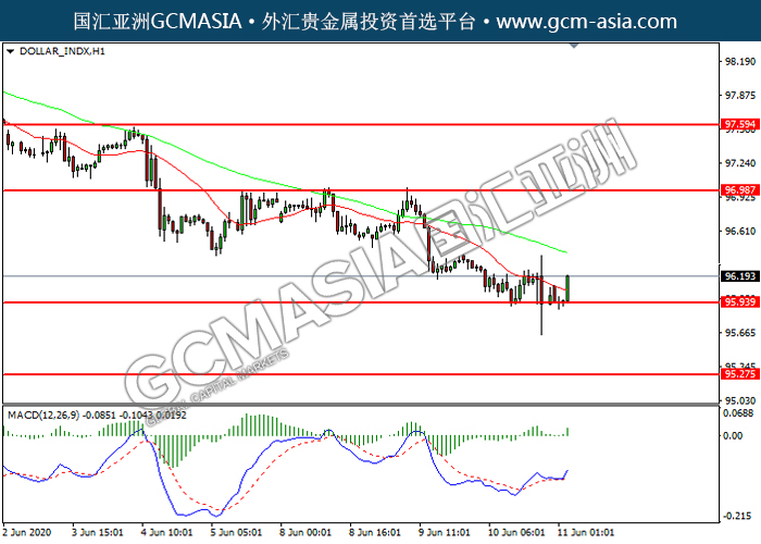 DOLLAR_INDX,H1:美指震荡盘整,目前测试着支撑位。MACD已形成金叉,动能转强,短期可关注多头为主。上方关97.00压力和97.60压力,下方关注95.95支撑和95.25支撑。