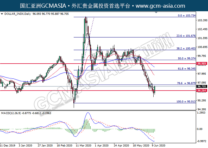 DOLLAR_INDX,Daily:美指低位反弹。MACD显示多头信号,中期可关注多头走势为主。上方关96.90压力和98.35压力,下方关注96.25支撑和95.00支撑。