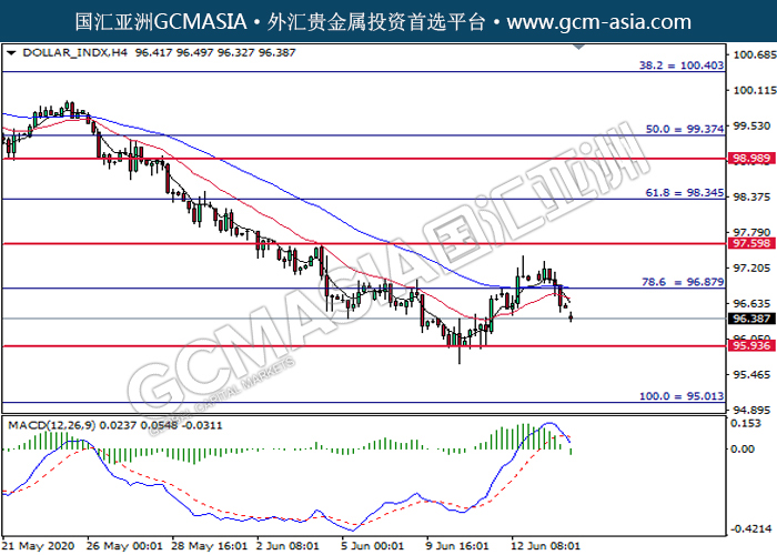 20200616 DOLLAR_INDX-午间 by keyk | Jun 16, 2020 | 美元指数 | 0 comments GCMAsia - DOLLAR_INDX DOLLAR_INDX 2020-06-16 DOLLAR_INDX,H4:美指突破后持续下行。MACD显示空头信号,短期可关注空头为主。上方关96.90压力和97.60压力,下方关注95.95支撑和95.00支撑。