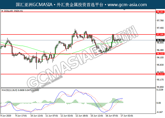DOLLAR_INDX,H1:美指震荡盘中,目前测试前期压力。MACD多头动能略减,短期可关注空头为主。上方关97.15压力和98.15压力,下方关注96.30支撑和95.40支撑。