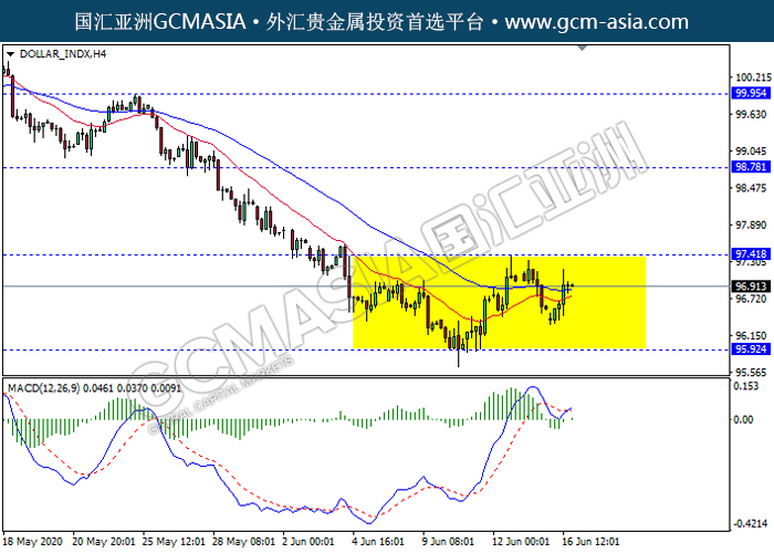 DOLLAR_INDX,H4:美指仍区间交易,近期低位反弹那。然而,MACD显示多头,形成金叉,短期可关注多头趋势为主。上方关97.40压力和98.80压力,下方关注95.90支撑和94.65支撑。