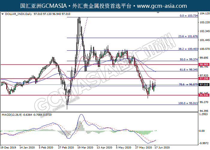 DOLLAR_INDX,Daily:美指突破后持续上行。MACD显示多头信号,中期可关注多头为主。上方关97.60压力和98.35压力,下方关注95.95支撑和95.00支撑。