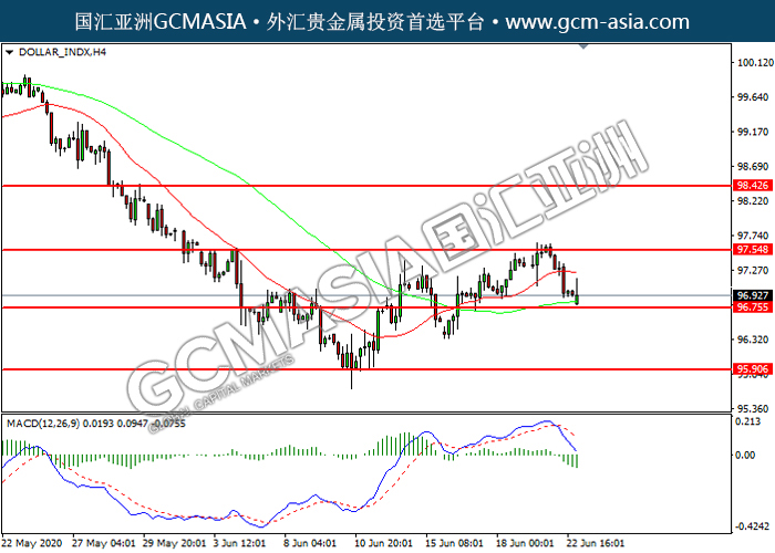 DOLLAR_INDX,H4:美指震荡下行,目前测试前期支撑。MACD空头动能略增,若下破可关注空头为主。上方关97.55压力和98.45压力,下方关注96.75支撑和95.90支撑。