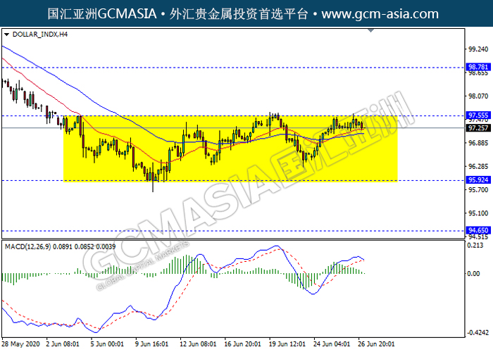 DOLLAR_INDX,H4:美指仍区间交易,目前测试前期压力。然而,MACD开始形成死叉,多头动能略减,短期关注技术性空头回调趋势为主。上方关97.55压力和98.80压力,下方关注95.90支撑和94.65支撑。