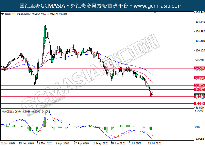DOLLAR_INDX,Daily:美指突破后持续下行,目前测试着支撑位。MACD显示空头动能偏强,若突破可关注空头趋势为主。上方关94.40压力和95.00压力,下方关注93.35支撑和92.30支撑。