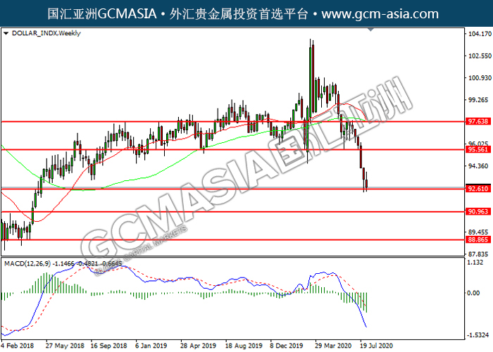 DOLLAR_INDX,Weekly:美指空头排列,目前测试前期支撑。MACD空头动能略增,若下破可关注空头为主。上方关95.55压力和97.65压力,下方关注92.60支撑和90.95支撑。