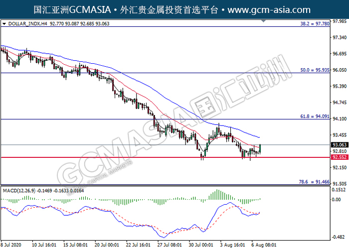 20200807 DOLLAR_INDX-午间 by keyk | Aug 7, 2020 | 美元指数 | 0 comments GCMAsia - DOLLAR_INDX DOLLAR_INDX 2020-08-07 DOLLAR_INDX,H4:美指低位反弹。MACD显示多头动能转强,短期关注多头为主。上方关94.10压力和95.95压力,下方关注92.55支撑和91.45支撑。
