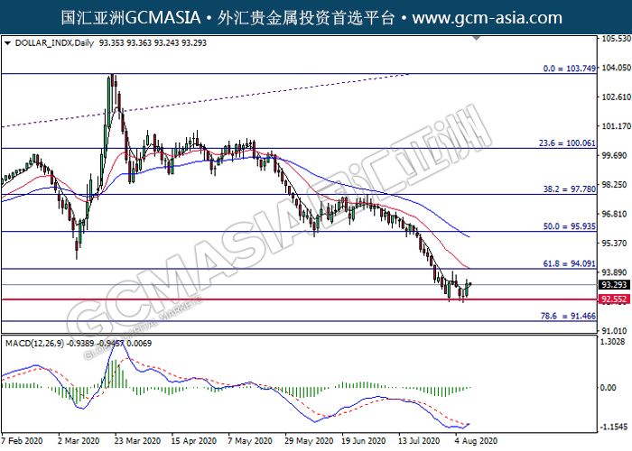 DOLLAR_INDX,Daily:美指低位反弹。MACD显示空头动能转弱,短期关注多头为主。上方关94.10压力和95.95压力,下方关注92.55支撑和91.45支撑。